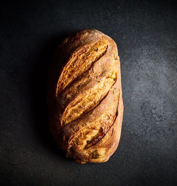 Hand dusted with flour, our olive sourdough is packed full of juicy, green olives & aromatic rosemary. This savoury combination of flavours balances well with the soft, wholesome crumb